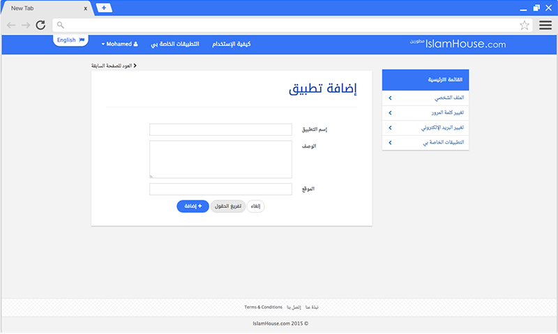 لكي يمكن التعامل مع البوابة يجب الحصول على مفتاح إتصال وهذا المفتاح يعتبر الهوية الخاصة بك احتفظ به ولا تخبر به احدا لأنه يُعد المعرف الخاص بك والذي يمكنك من التعامل مع الموقع لكي تحصل على مفتاح الإتصال قم بالضغط على زر تطبيق جديد سيتم تحويلك إلى الصفحة الخاصة بإنشاء تطبيق جديد حيث تقوم بإدخال إسم التطبيق والوصف الخاصة به والموقع ان وُجد وهذه البيانات تساعد دار الإسلام في التعرف على التطبيقات المنشأة ومراجعتها حيث يجب الإلتزام بإدخال بيانات حقيقية او صحيحة إن أمكن وإلا ستُعرض أن يتم إيقاف التطبيق الخاص بك.