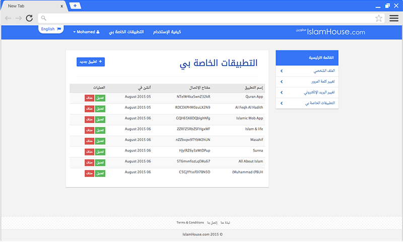 بعد إنشاء التطبيق الخاص بك يتم تحويلك إلى لوحة التحكم الخاصة بالتطبيقات حيث يظهر لك إسم التطبيق ومفتاح الإتصال الخاص بك حيث يكون بالشكل التالي 54N4jsgRqB0yhh5lJ كل تطبيق له مفتاح إتصال خاص به حيث لا يمكن الإتصال بالموقع إلا من خلال إستخدام مفتاح إتصال مفعل ( مثل ما يحدث في تويتر وفيس بوك ) ويفضل أن يكون لكل خدمة أو تطبيق المفتاح الخاص به لأنه لدينا حد أقصى من عدد الطلبات في الساعة الواحدة وهو 5000 ويمكن زيادته حسب الطلب وذلك لحماية السيرفر واستخدام نفس المفتاح في جميع التطبيقات قد يؤدي إلى الوصول للحد الأقصى وإيقاف الخدمة حتى مرور ساعة لأن هذا العدد هو العدد المخصص في الساعة الواحدة . رابط البوابة يكون بالشكل التالي http://api.islamhouse.com/v1/54N4jsgRqB0yhh5lJ وهذا الرابط ثابت في جميع الروابط ويلاحظ أن مفتاح الإتصال الخاص بكم هو 54N4jsgRqB0yhh5lJ يرجى الإحتفاظ به وعدم إعطاؤه لأحد ويمكنكم انشاء حساب ومفتاح خاص بكم واستبداله او تغييره في أي وقت من لوحة التحكم قم بإستبدال مفتاح الإتصال الخاص بك بالمفتاح المذكور في المثال حيث ان هذا المفتاح لمجرد الشرح وغير مسموح إستخدامه في عملية الإتصال
